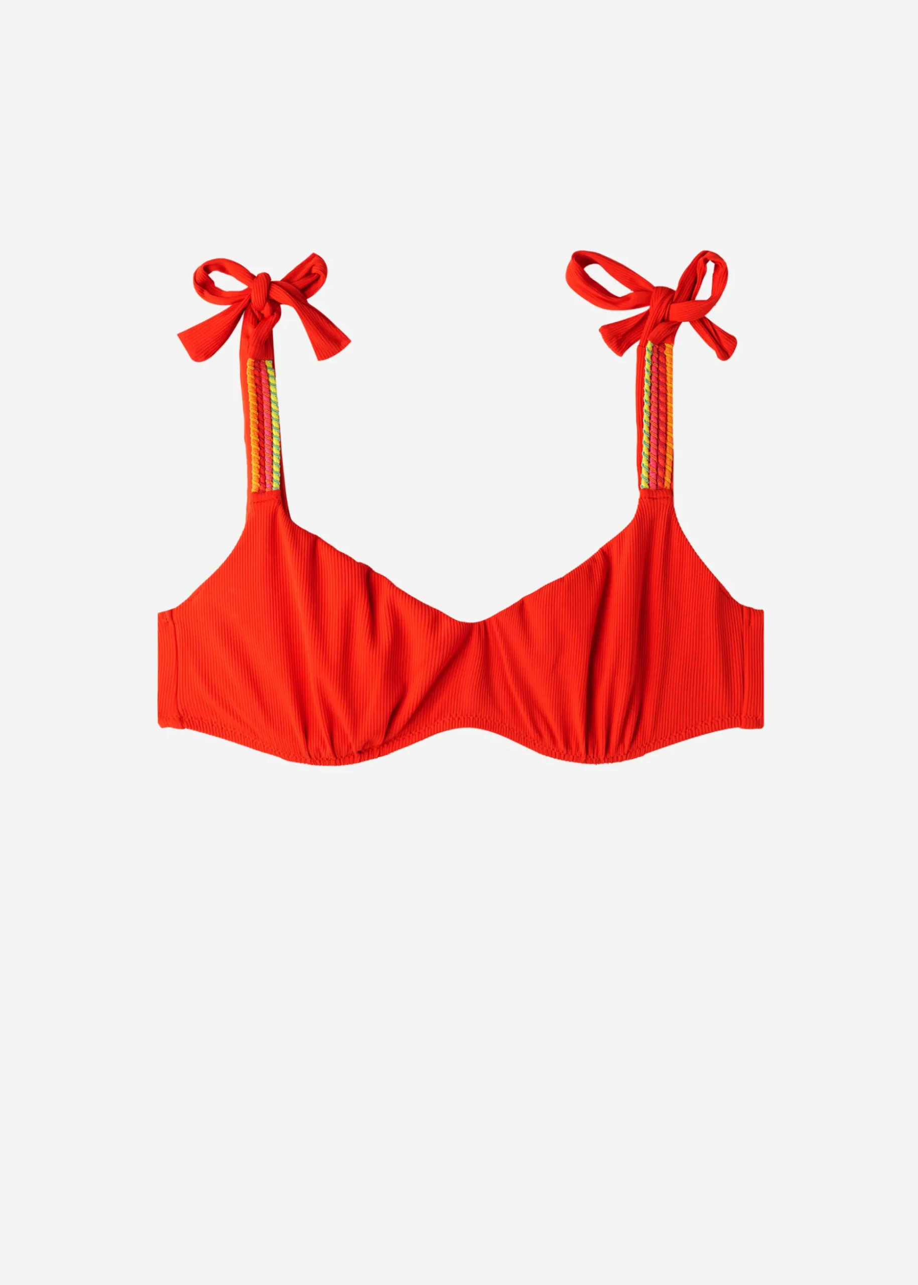 Underwired Brassiere Bikini Top And Non-Padded Cups For A Natural Effect. Soft Fabric With A Slightly Raised Micro-Rib Effect Embellished With Passementerie In Bright Hues. The Straps Can Be Adjusted With The Bows At The Shoulders. Back Bow Fastening.