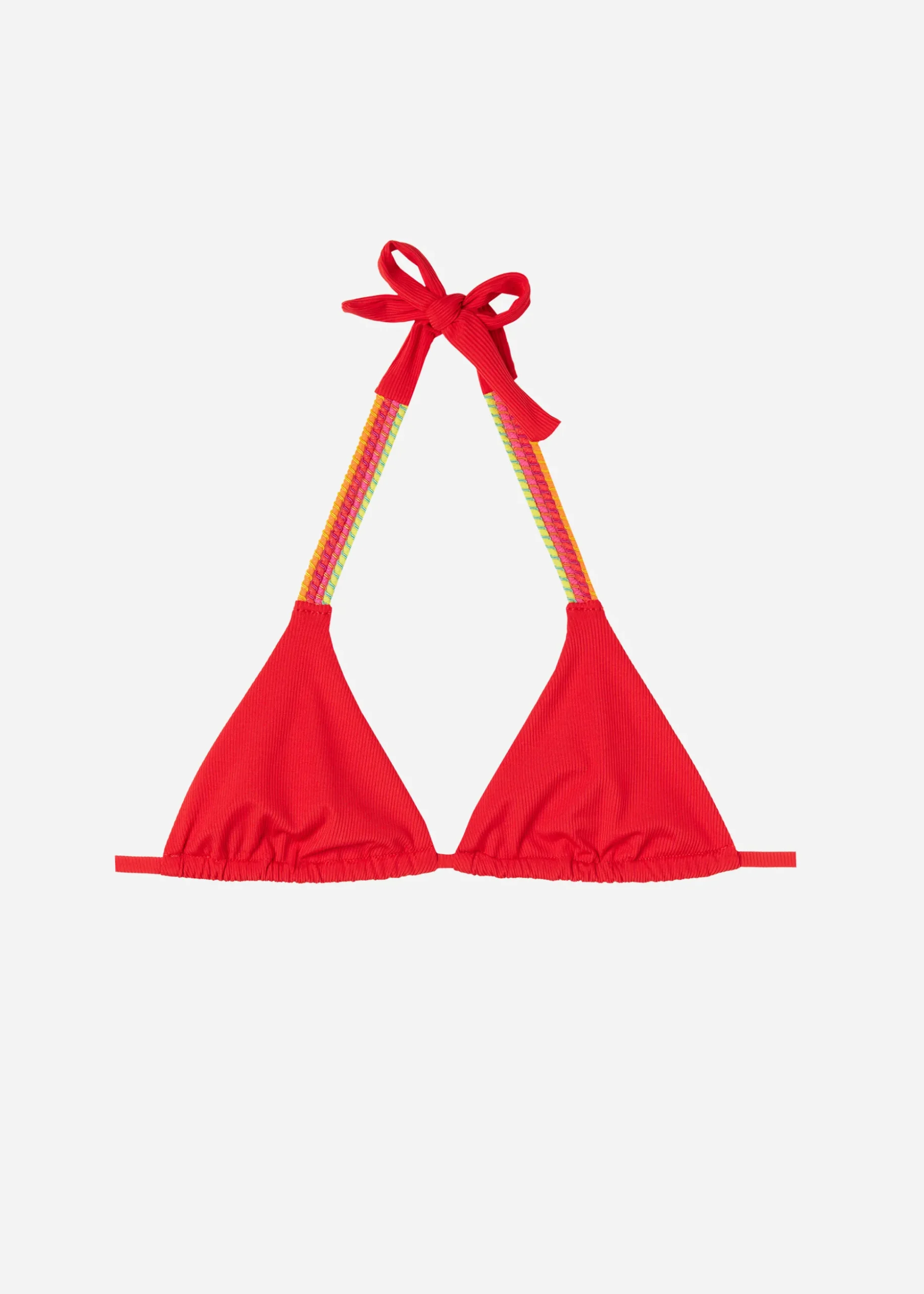Slide Triangle Bikini Top With No Underwire For A Natural Effect. Internal Slots To Insert Padding (Czm086, Sold Separately). Soft Fabric With A Slightly Raised Micro-Rib Effect Embellished With Passementerie In Bright Hues. Non-Adjustable Shoulder Straps That Tie In A Bow Around The Neck. Thin Tie Fastening At The Back.