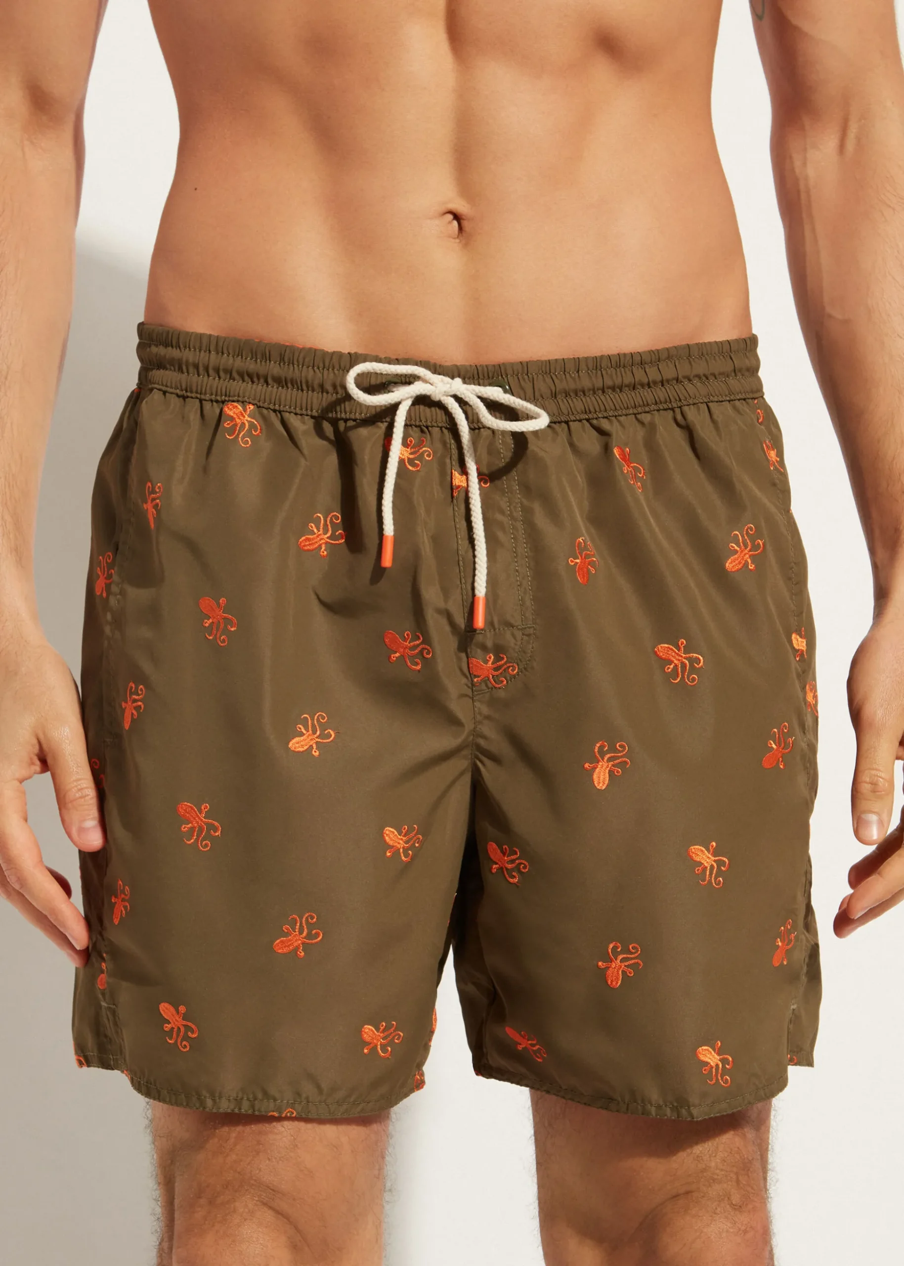 Men’s Fabric Boxer Swim Shorts With Elastic Waistband And Contrasting-Colour Interior. Drawcord With Coloured Tip. Mid-Thigh Length With Side Pockets And Inner Mesh. Rear Patch Pocket.